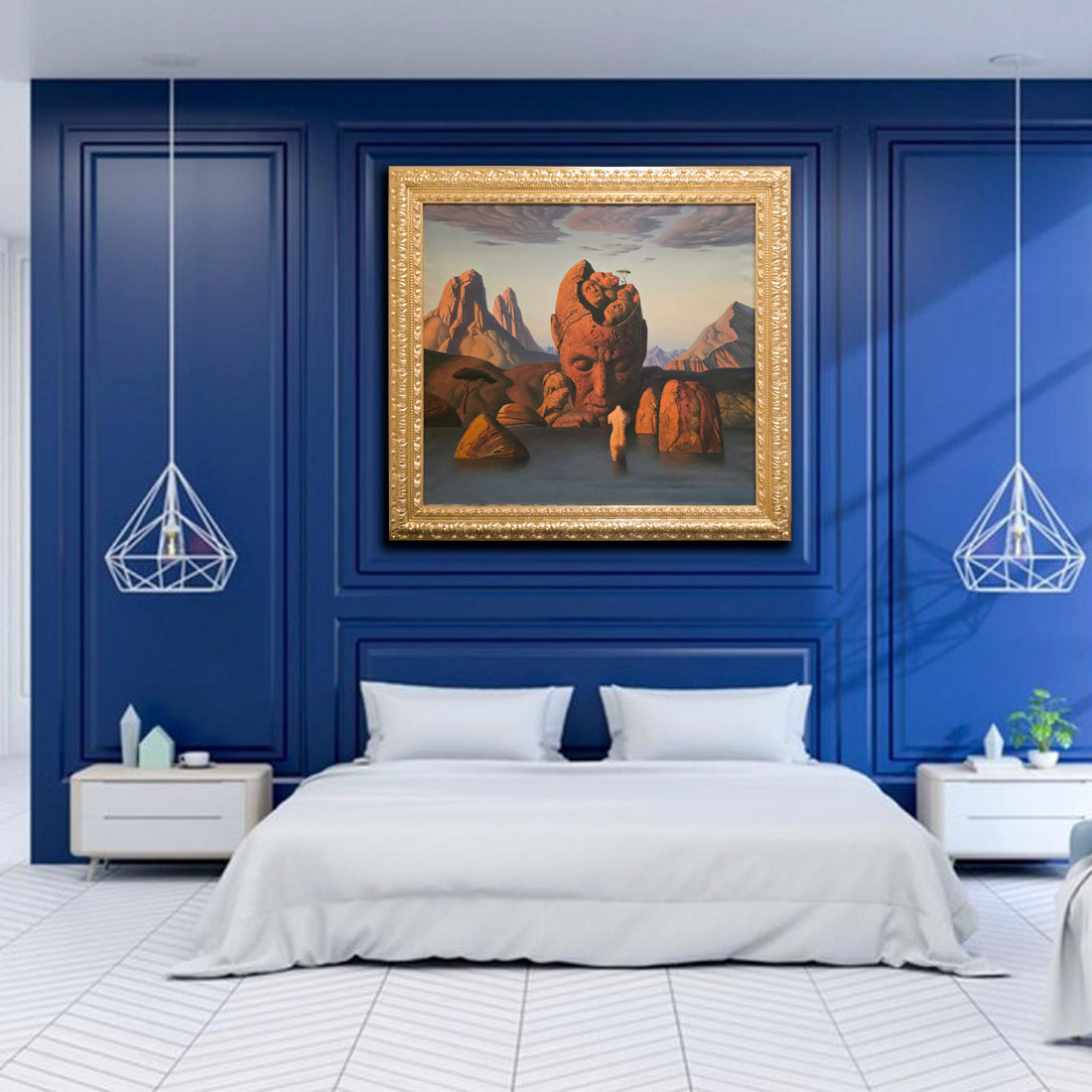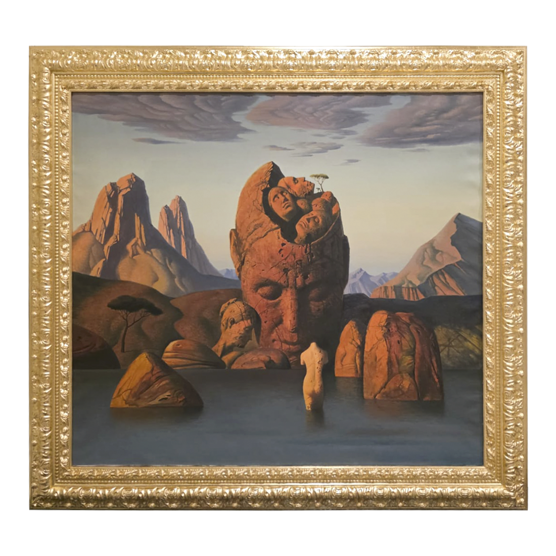 Immerse your space in surreal beauty and thought-provoking symbolism with Big Head, a striking original oil painting by internationally renowned artist Evgueni Gordiets. Featuring a monumental stone face resting amidst a dreamlike landscape, this work blends mysticism with emotional depth, inviting endless interpretation.
